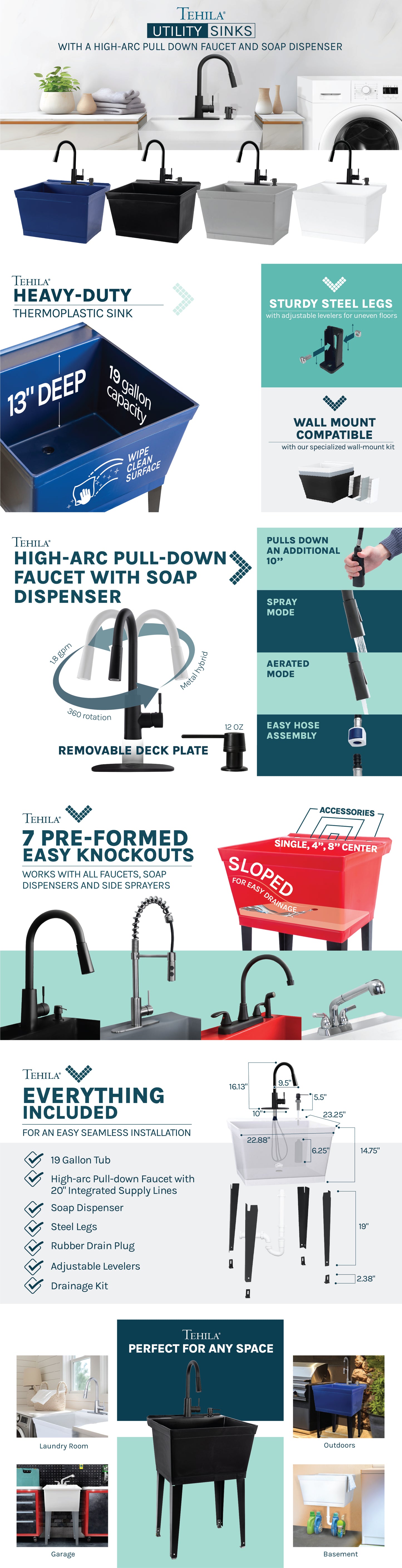 Tehila Standard Freestanding White Utility Sink with Black Finish High-Arc Pull-Down Faucet and Soap Dispenser