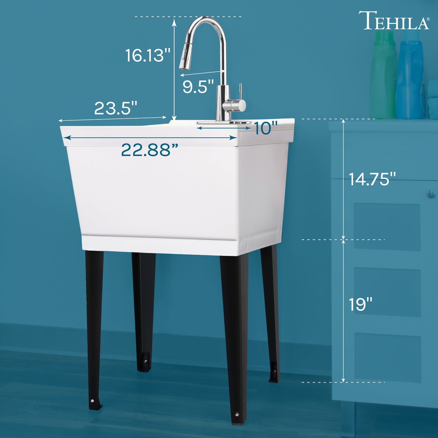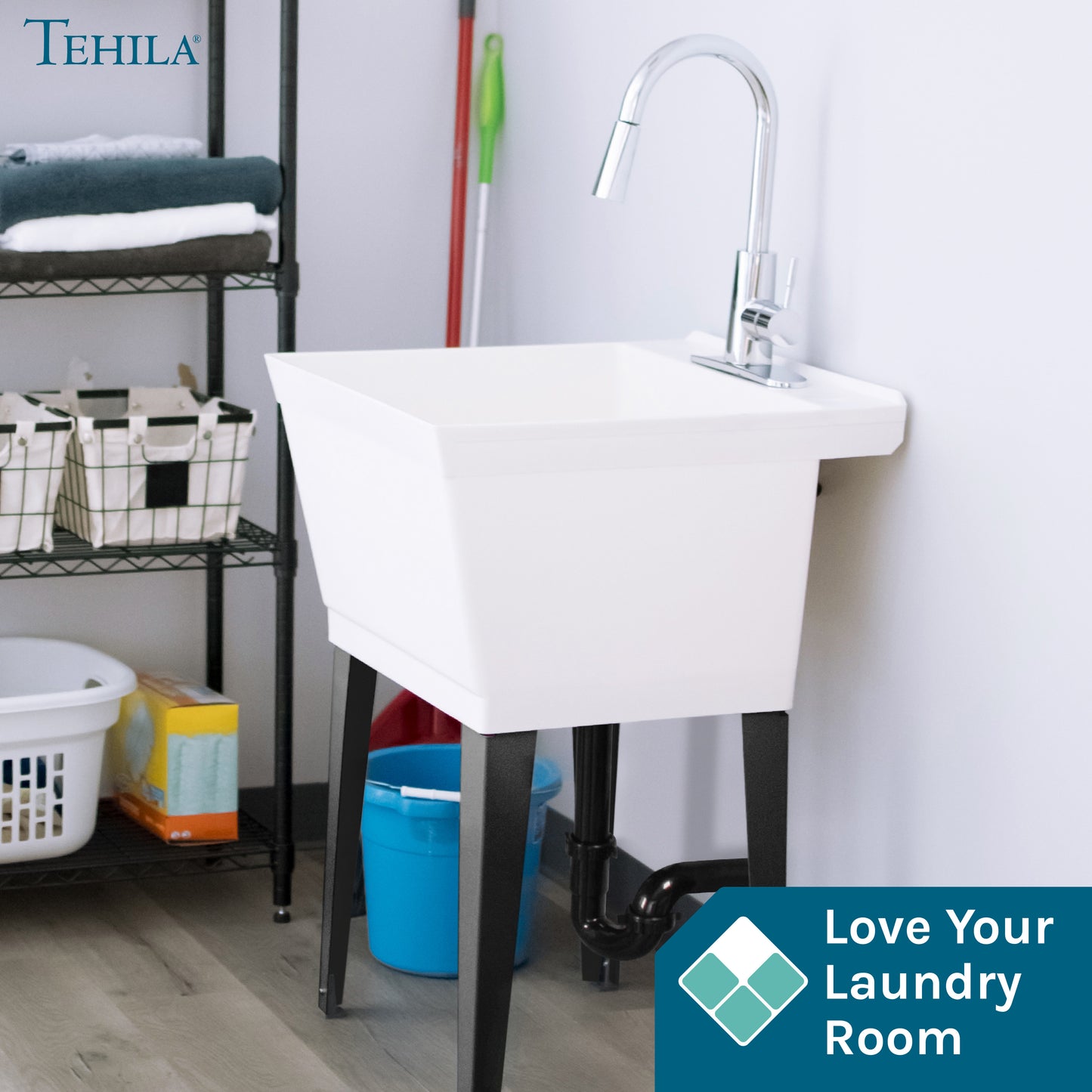 Our most popular laundry tub set. The 3.5-inch pitched back deck catches splashes and offers a convenient place for hand soap, stain remover sticks, or scouring pads to rest. Sturdy rust-proof steel legs attach easily while floor levelers increase stability. Adjust the levelers to the perfect height to level the tub on bumpy or uneven surfaces, such as the floor of a utility room, basement, or industrial workshop.