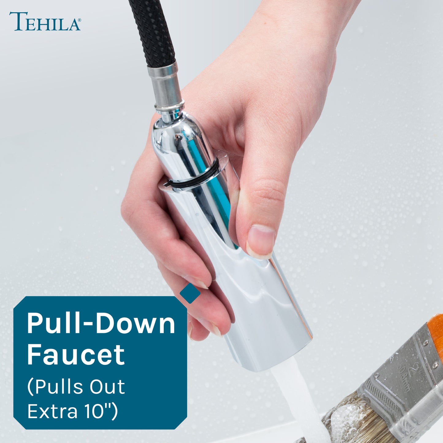 This high-arc faucet gives you plenty of clearance for cleaning oversized items. The sprayer head features both stream and spray functions to help with filling and rinsing. This sprayer head pulls down to assist you with cleaning tools or hand-washing delicate laundry.