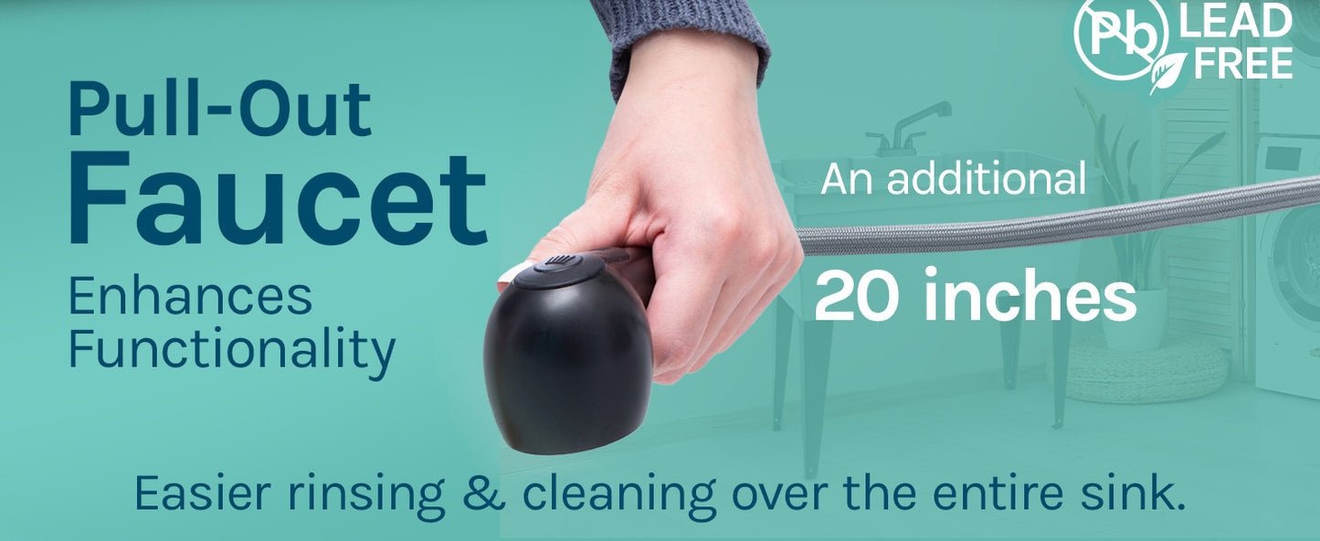Complementing its sturdy construction is a sleek black pull-out faucet that enhances versatility. The utility sink faucet with sprayer provides a convenient washing experience, ideal for a kitchen sink and cabinet combo or a laundry room sink.