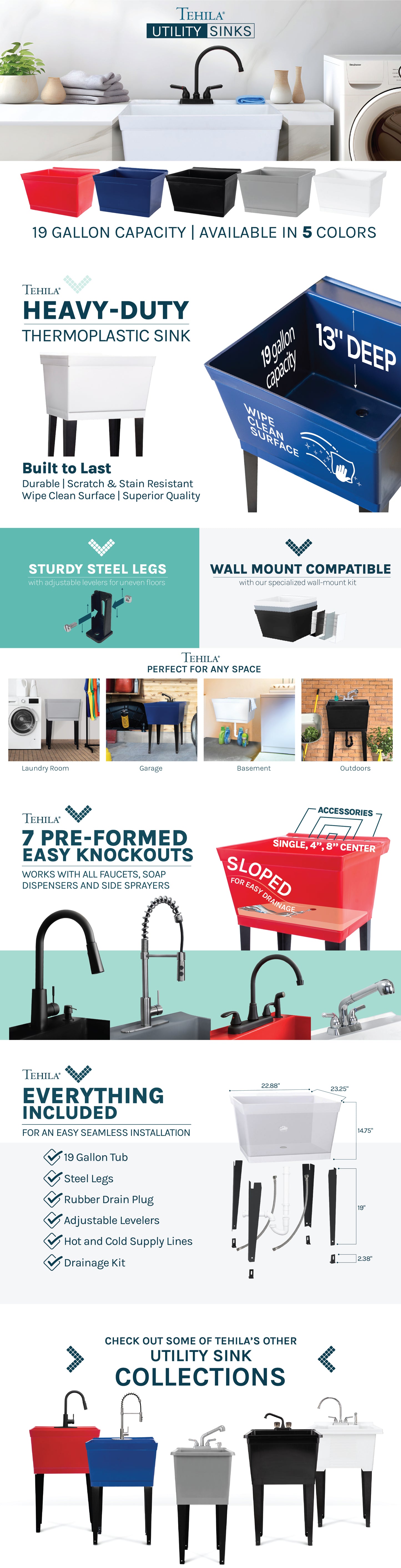 Our most popular laundry tub set. The 3.5-inch pitched back deck catches splashes and offers a convenient place for hand soap, stain remover sticks, or scouring pads to rest. Sturdy rust-proof steel legs attach easily while floor levelers increase stability. Adjust the levelers to the perfect height to level the tub on bumpy or uneven surfaces, such as the floor of a utility room, basement, or industrial workshop.