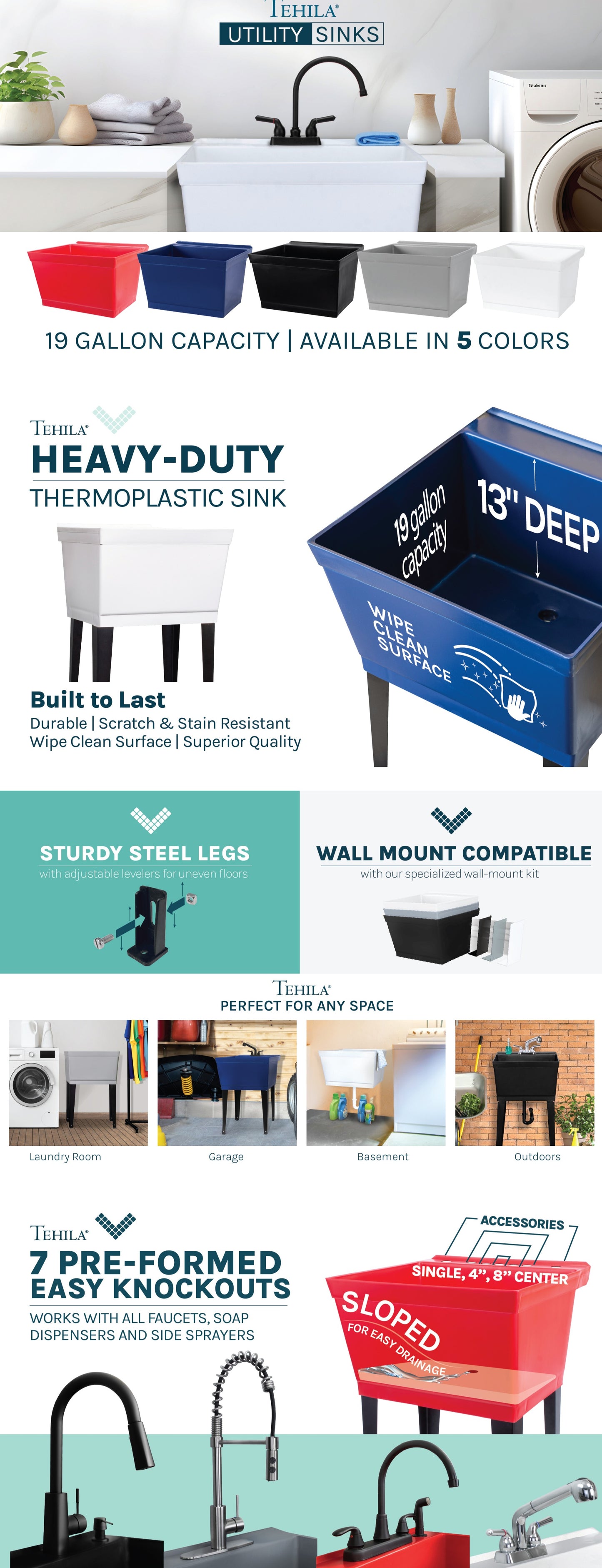 Our most popular laundry tub set. The 3.5-inch pitched back deck catches splashes and offers a convenient place for hand soap, stain remover sticks, or scouring pads to rest. Sturdy rust-proof steel legs attach easily while floor levelers increase stability. Adjust the levelers to the perfect height to level the tub on bumpy or uneven surfaces, such as the floor of a utility room, basement, or industrial workshop.