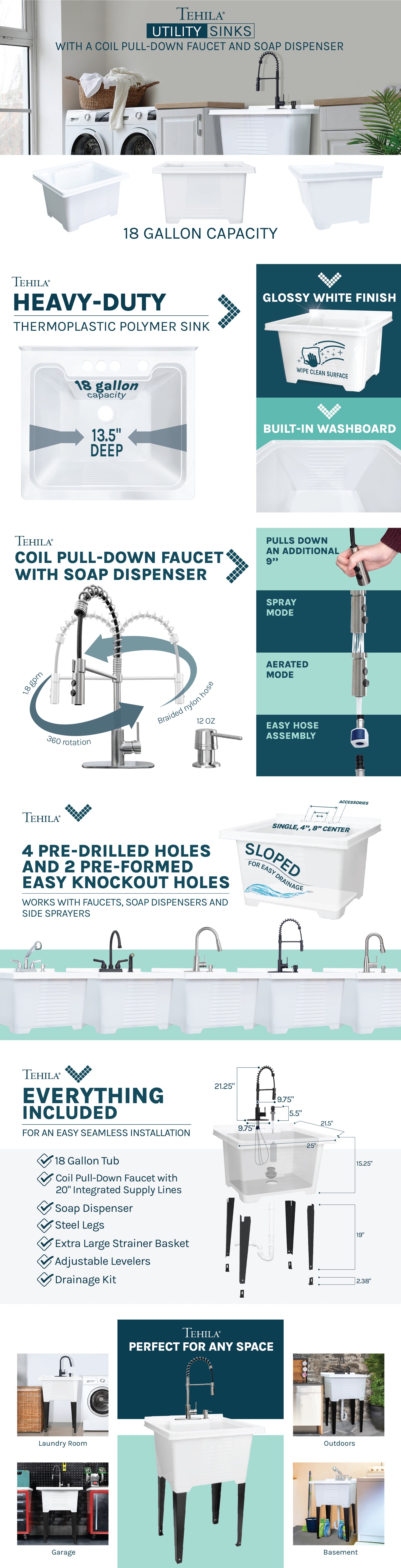 This freestanding Tehila Luxe Utility Sink comes with everything you need to update your laundry room, basement, mudroom, or workshop. This glossy white sink brings a new modern sensibility to any home.
